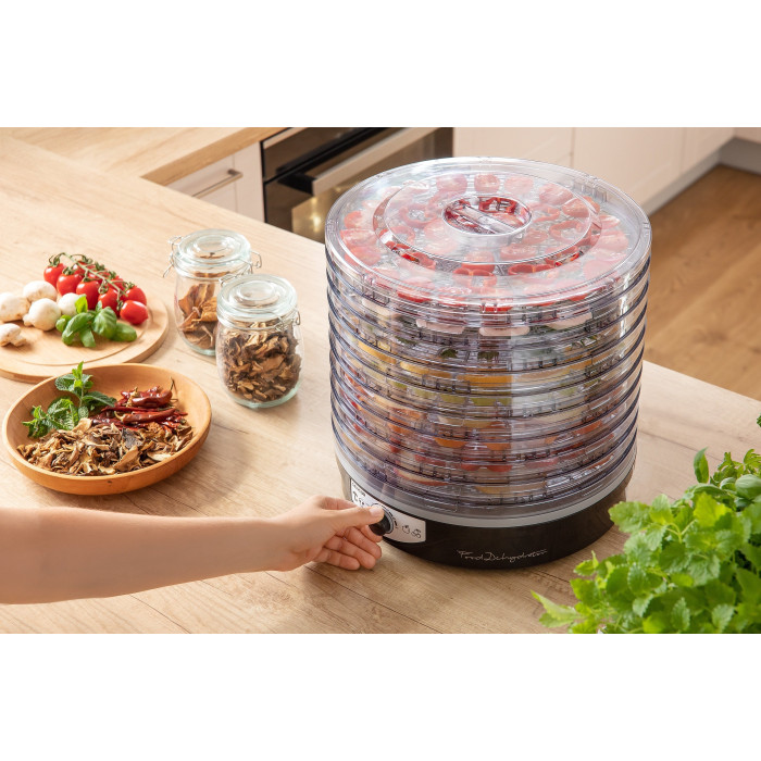 Цей дегідратор геніально розроблений на основі конвекції гарячого повітря для вилучення вологи з продуктів харчування. Під час процесу зневоднення лотки слід обертати, щоб забезпечити рівномірне зневоднення вмісту. Найближчі до дна лотки піддаються найбільшому нагріванню - тут процес зневоднення відбувається швидше. Тому просто вийміть їх і поставте на вищий рівень, а вищі лотки перемістіть ближче до нижньої частини дегідратора.