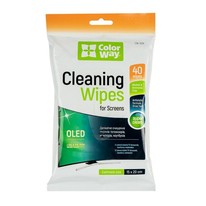Чистячі серветки ColorWay для чищення екранів, моніторів, ноутбуків, телевізорів, смартфонів, комп’ютерів, периферії та іншої офісної та домашньої електроніки. Призначені для вологого чищення сильних забруднень, плям, потертостей, пилу та інших плям різного ступеня забрудненості. Серветки виготовлені з високоякісного матеріалу і легко відриваються. Абсолютно нейтральні на запах. Після чищення не залишають розводів, швидко висихають, забезпечуючи відмінний результат. Упаковка серветок зручна для перенесення, що дозволяє легко брати їх із собою у поїздки чи офіс. Серветки мають розмір 15х20 см, що зручно обробляти різні розміри екранів. В упаковці міститься 40 серветок, що чистять, розміром 15х20 см. Це не тільки зручно для ретельного очищення екранів різних розмірів, але також надає достатню кількість для тривалого використання.