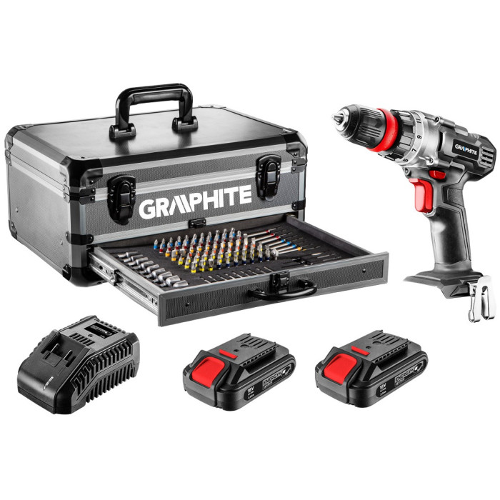 Набір GRAPHITE Energy +. До складу набору входять: дриль-шуруповерт, два акумулятора 2.0 Аг (58G002), зарядний пристрій (58G001) і 109 допоміжного приладдя - змінних наконечників і свердел. Все упаковано в функціональний і міцний алюмінієвий кейс. Кейс з окремими місцями під кожен елемент набору. У головному відділенні кейса є простір для додаткового приладдя користувача. Вхідні в набір змінні наконечники виготовлені зі сталі S2 високої твердості. Набір - це ідеальне рішення для кожного, хто цінує зручне зберігання і транспортування свого улюбленого інструмента, без ризику його пошкодження в результаті впливу зовнішніх факторів.