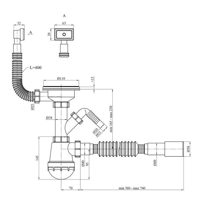 Сифон, випуск, перелив, відведення до пральної машини, гофротруба.