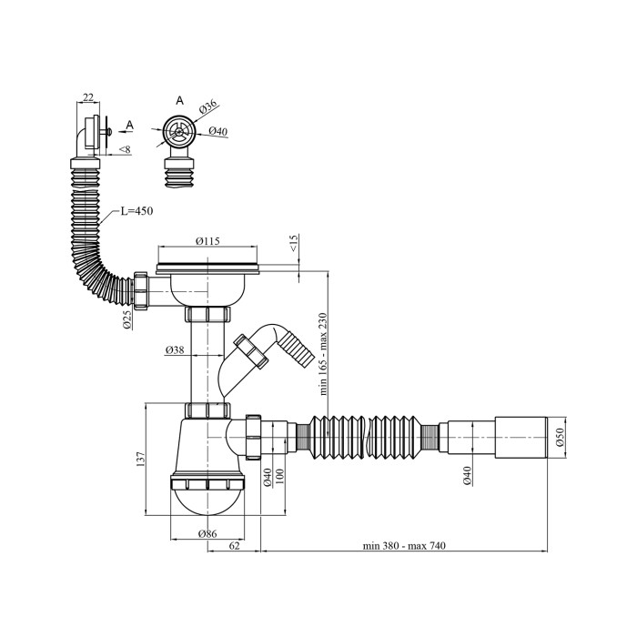 Вигляд затвора. Сифон має мокрий затвор без мембрани. Це забезпечує надійне утримання води та запобігає запахам з каналізації.