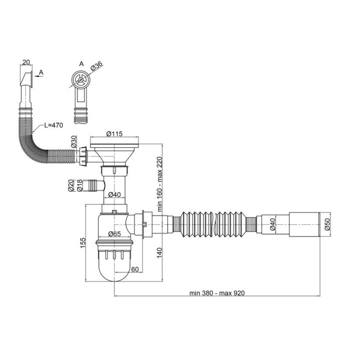 Довжина переливу: 470 мм. Довжина гофрованої труби: 380 – 920 мм.