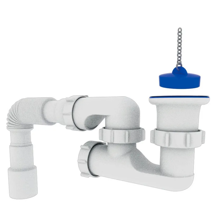 Сифон, гнучка труба 40х40/50 для підключення до каналізації, сітка випуску, пробка
