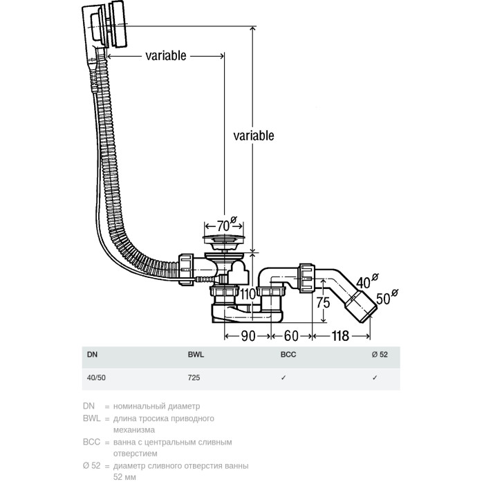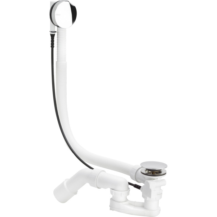 Сифон VIEGA автомат 725 мм; плоска конструкція, потрібна лише 33 мм вільного місця за ванною; комплектація: гнучка труба переливна, поворотна накладка переливного отвору (верхня), пробка зі штоком клапана, гідрозатвор, зливне коліно 45°