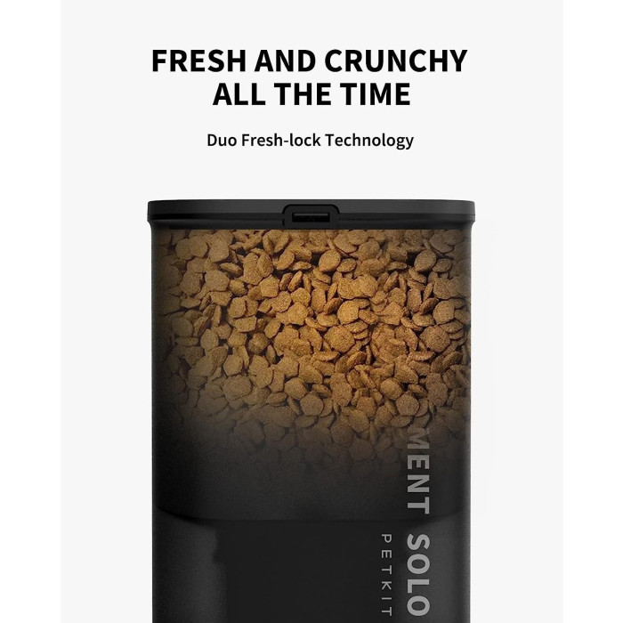 Fresh Element Solo пропонує автоматичне годування за розкладом, що налаштовується, дозволяючи власникам тварин встановлювати розмір порцій і час годування за допомогою додатку Petkit. Це забезпечує послідовне та збалансоване харчування для вашого улюбленця, запобігаючи переїданню або недоїданню.