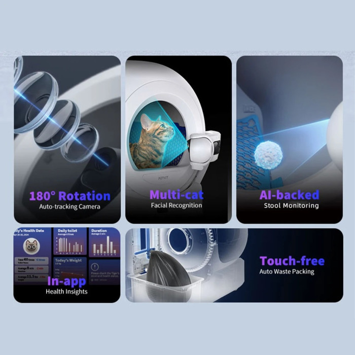 Камера робить знімки калу і грудок після кожного циклу прибирання, попереджаючи вас про ознаки запору, діареї, гематурії та інших проблем з кишківником і сечовивідними шляхами на основі кольору калу, його консистенції та розміру грудок. Ви можете переглянути зображення калу кішок на тимчасовій шкалі додатка і порівняти їх з нашою таблицею перевірки здоров’я випорожнень, що полегшує попередній скринінг на можливі захворювання вихованця.