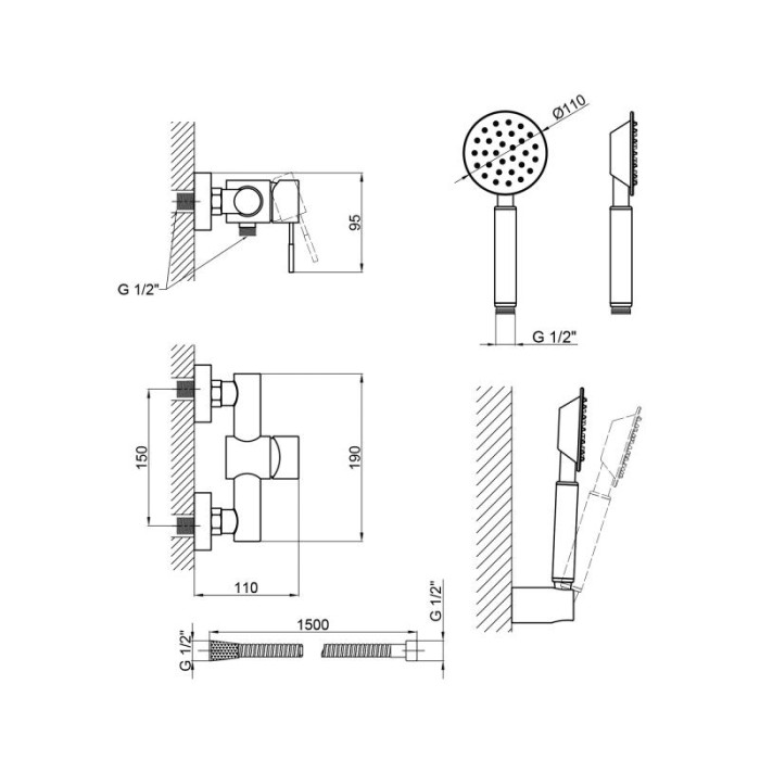 Змішувач, лійка для ручного душу, душовий шланг, кронштейн, кріплення.