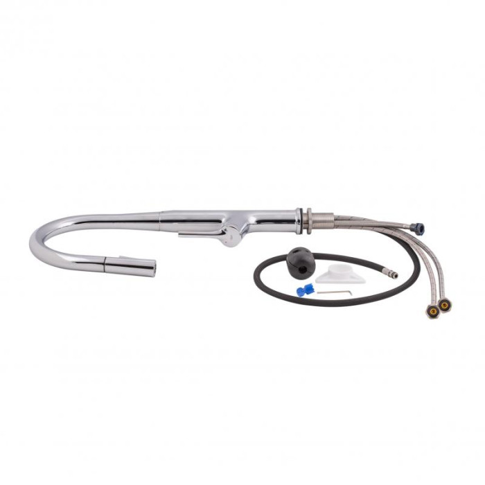 Змішувач, гнучкий підвід, шланг для висувної лійки, ключ для аератора, якір, кріпильні деталі.
