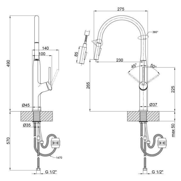 Довжина висувного шланга - 1470 мм. Довжина гнучкого підводу - 570 мм.