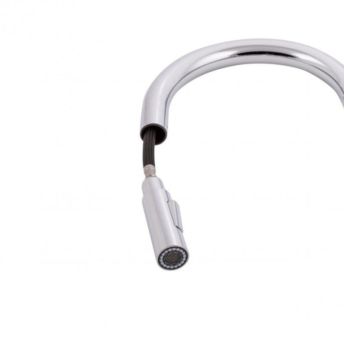 Змішувач для кухні з висувним виливом Qtap Anicka 9136103UC виготовлено з високоякісної латуні з глянцевим хромованим покриттям, що забезпечує довговічну безперебійну роботу виробу. Завдяки висувній формі виливу і двом режимам подачі струменя, які перемикаються кнопкою на виливі, можна з легкістю очистити важкодоступні місця на посуді. Довжина висувного шланга - 1470 мм. Управління температурою і напором води здійснюється за допомогою зручного важеля.