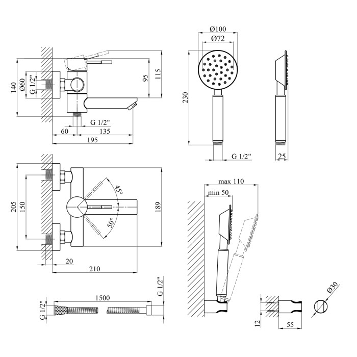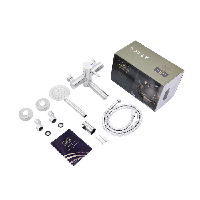 Змішувач, лійка для ручного душу, душовий шланг, кронштейн для ручного душу, кріплення, інструкція.