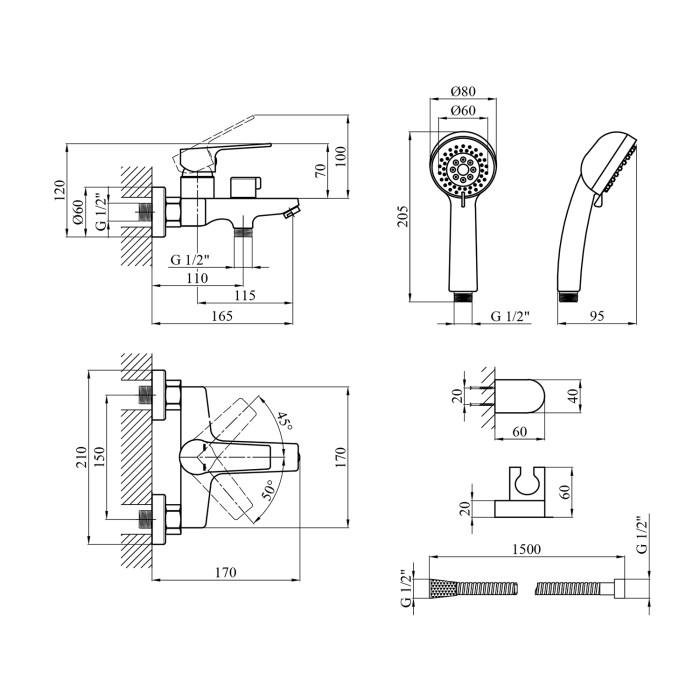 Змішувач, лійка для ручного душу, душовий шланг, кронштейн для ручного душу, кріплення, інструкція.