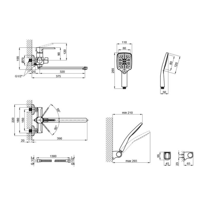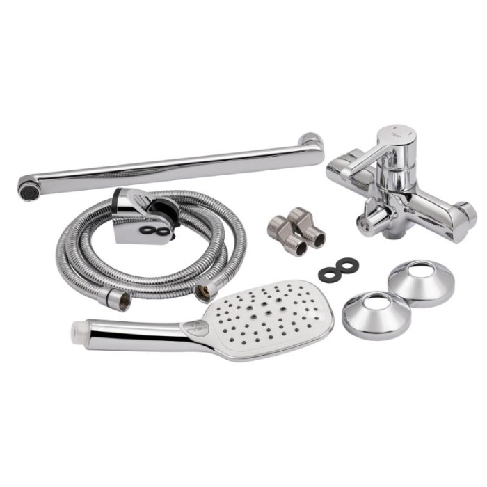 Змішувач, лійка для ручного душу, душовий шланг, кронштейн, кріпильні деталі.