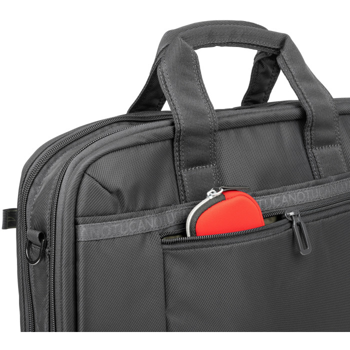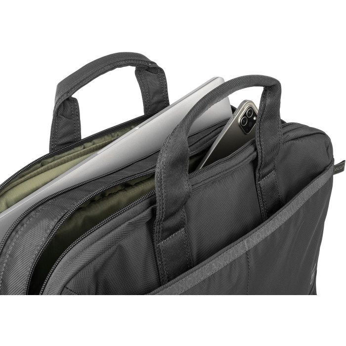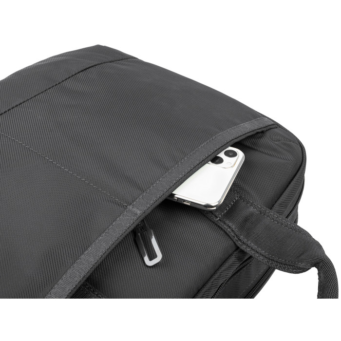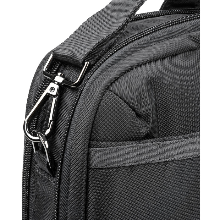 Велика, і містка сумка Astra 15 з ідеальним розташуванням кишень і двома практичними внутрішніми відділеннями, що закриваються на блискавку, одне з цих відділень призначене для ноутбуків з діагоналлю до 15,6-16"або MacBook Pro 16", а другий відсік - органайзер, для документів, планшета, і письмового приладдя. На фронтальній стороні сумці є зручна широка кишеня для аксесуарів таких як мишка, блокнот, блок живлення. Ще одна не велика кишеня на тильній стороні сумки, яка також може служити фіксатором сумки на телескопічній ручці валізи. Плечовий ремінь регулюється по довжині і знімається. Фурнітура з металу.