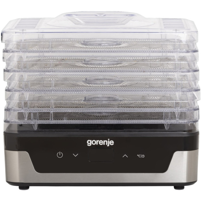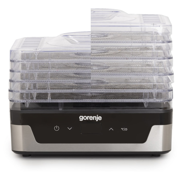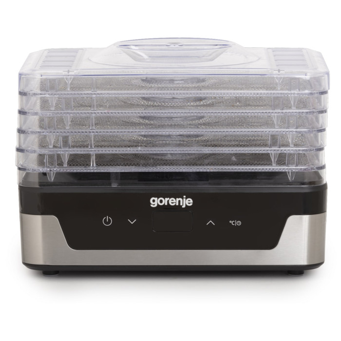 Сушарка для продуктів Gorenje FDK400DE з електронним керуванням та потужністю 240 Вт має 5 регульованих лотків діаметром 29 см і дозволяє сушити фрукти, овочі, м’ясо, рибу, гриби та інші продукти при температурі від 35 °C до 75 °C. Оснащена LED-дисплеєм, таймером до 48 годин, автоматичним вимкненням та гумовими ніжками для стійкості.