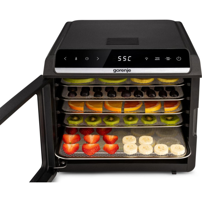 Сушарка для продуктів Gorenje FDK600DB із потужністю 580 Вт та 6 лотками діаметром 25 см забезпечує рівномірне висушування на всіх рівнях. Має LED-дисплей, електронне керування, регулювання часу від 0,5 до 48 годин та те... Читати далі...