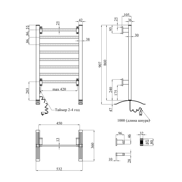 8 секцій рівномірно розподіляють тепло, а вбудований таймер на 2 та 4 години дозволяє зручно керувати часом роботи. Максимальна температура нагріву — до 50°C, що забезпечує ефективне сушіння рушників, не пересушуючи тканину.