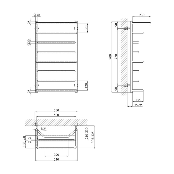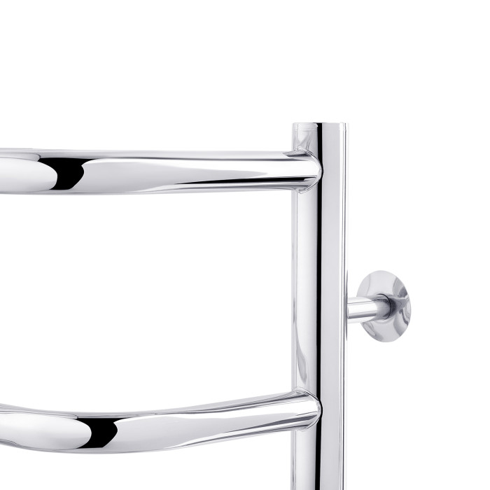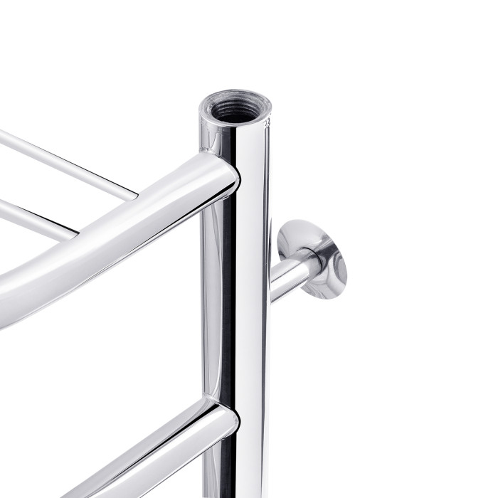 Модель кріпиться до стіни за допомогою кріплень, має верхнє та нижнє підключення до гарячого водопостачання. Діаметр підключення 1/2". Діаметр стійки - Ø30, товщина стійки - 1.5 мм, діаметр перемички - Ø20, товщина перемички - 1.5 мм. Максимальна робоча температура до 90 °C. Робочий тиск - 15 Атм.