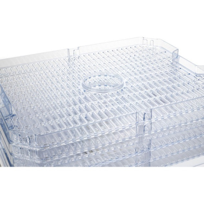 Сушарка має 5 сушильних піддонів діаметром 38 см і висотою 2 см, що дозволяє сушити велику кількість продуктів за один раз. Прямокутна форма виробу дозволяє розміщувати продукти ефективно, забезпечуючи оптимальне використання простору.