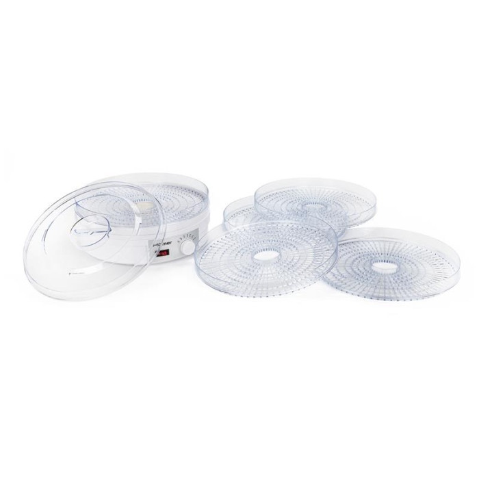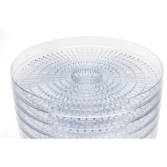 5 незалежних піддонів висотою 3 см і діаметром 32 см дозволяють викласти продукти в п’ять рівнів і сушити їх одночасно. Особливості конвекції перешкоджають змішуванню запахів, якщо ви сушите різні продукти одночасно. Сушіть овочі, фрукти, ягоди, лікувальні трави, домашні макаронні вироби, хліб, гриби, рибу й багато чого іншого. Для дрібних ягід передбачена спеціальна насадка. Також сушка дозволяє готувати домашню пастилу.