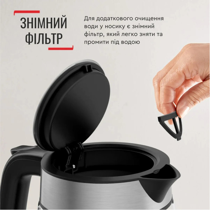 Обертання на 360 °, Відкидна кришка, світловий індикатор, Знімний фільтр від накипу, Кнопка ввімкнення/вимкнення/з підсвіткою