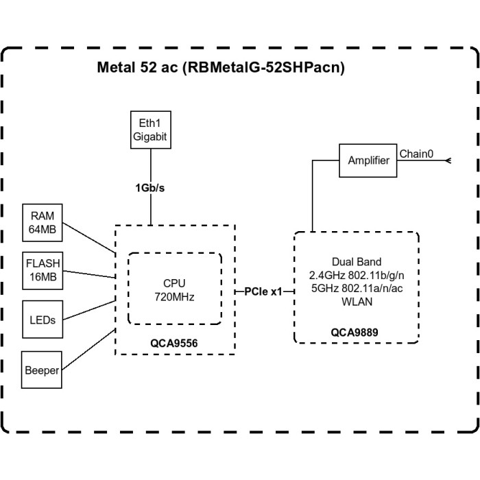 MikroTik Metal 52 ac (RBMetalG-52SHPacn) - вулична дводіапазонна точка доступу у водонепроникному металевому корпусі. Підтримує бездротові стандарти 802.11 b/g/n на частотному діапазоні 2.4 GHz або 802.11 a/n/ac на частоті 5 GHz. Ширина каналу складає 80 MHz. Швидкість Wi-Fi сягає 450 Mbps. Призначена для з'єднань точка-точка, а також може працювати як пристрій, що роздає або клієнтський. Антена – всеспрямована, знімна з коефіцієнтом посилення 6 dBi на частоті 2.4 GHz та 8 dBi на 5 GHz.