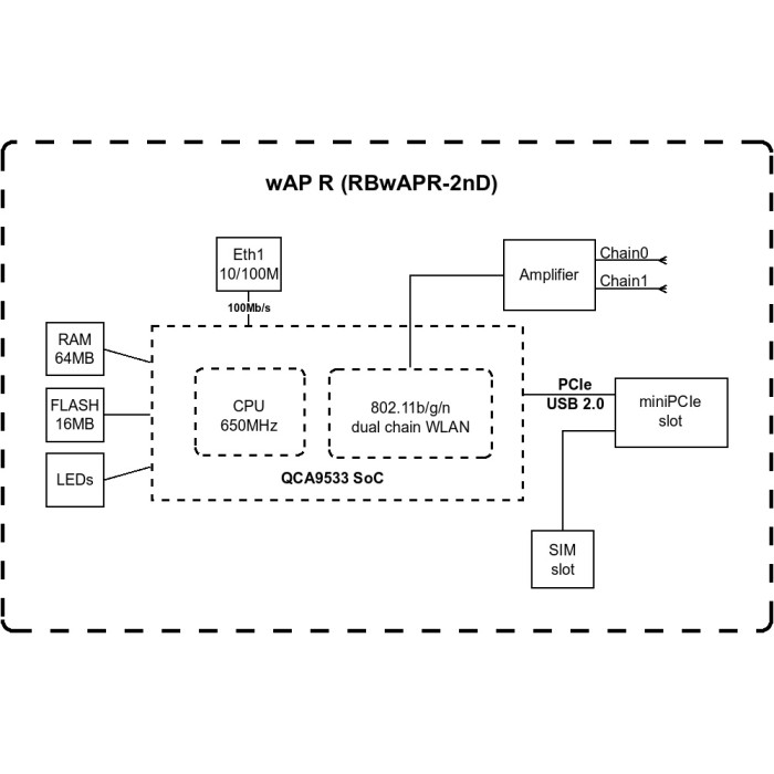 MikroTik WAP R (RBwAPR-2nD) - невеличка точка доступу, що працює в частотному діапазоні 2.4 GHz з miniPCI-e слотом для підключення LTE модему, Mini SIM слотом для карт стільникових операторів та LTE антенами. LTE модем (miniPCi-e карта) в комплект постачання не включений, користувач може вибрати та встановити його самостійно. Пристрій оснащений одним 10/100 Ethernet портом для підключення провідних пристроїв.