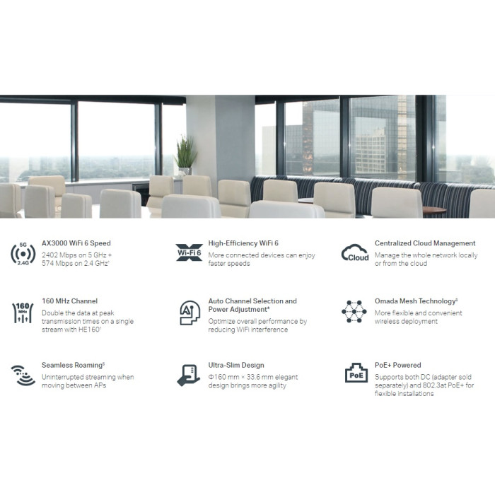 EAP653 Точка доступу WiFi 6 для кріплення на стелі AX3000. Надшвидкісний Wi-Fi 6: одночасна швидкість 574 Мбіт/с на частоті 2,4 ГГц і 2402 Мбіт/с на частоті 5 ГГц забезпечує загальну швидкість WiFi 2976 Мбіт/с. Високоефективний Wi-Fi 6: більше підключених пристроїв можуть насолоджуватися більшою швидкістю. Централізоване хмарне керування: інтеграція Omada SDN керує всією мережею локально або з хмари через веб-інтерфейс або програму Omada. Канал 160 MHz: Подвоїть дані в часи пікової передачі в одному потоці з HE160. Безперервний роумінг: відеопотоки та голосові дзвінки не впливають, коли користувачі переміщуються між місцями. Omada Mesh:Забезпечує бездротове з’єднання між точками доступу для розширення діапазону та гнучкого розгортання. Живлення PoE+: Підтримує джерело живлення 802.3at PoE+ і DC (адаптер постійного струму продається окремо) для гнучкої установки. Ультратонкий дизайн: 160 мм × 33,6 мм, елегантний дизайн забезпечує більше маневреності.