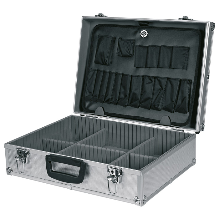 Кейс для інструмента алюмінієвий TOPEX розміром 45 x 15 x 32 см. Кейс універсального застосування завдяки легкої конструкції, а також системі перегородок і кишень. Внутрішня частина оброблена м'яким матеріалом, який захищає інструмент. Крім того, посилені краї захищають кейс від зносу. Оснащений двома замками з ключами. Бренд TOPEX призначений для домашніх майстрів.
