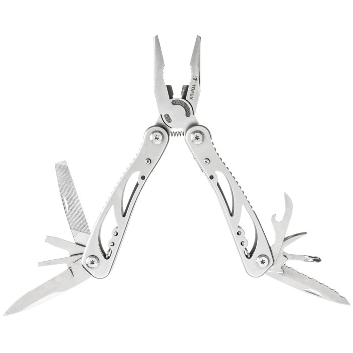 Багатофункціональний інструмент TOPEX довжиною 165 мм. Корпус з нержавіючої сталі забезпечить міцність і стійкість до корозії. Один інструмент поєднує в собі багато різних функцій, зокрема, найпопулярнішу викрутку PH2, гострий ніж, без якого не обійтися в багатьох ситуаціях, а також необхідну в турпоходах відкривачку для пляшок і консервних банок. Чохол з міцного нейлону полегшує транспорт і зберігання. Бренд TOPEX призначений для домашніх майстрів.
