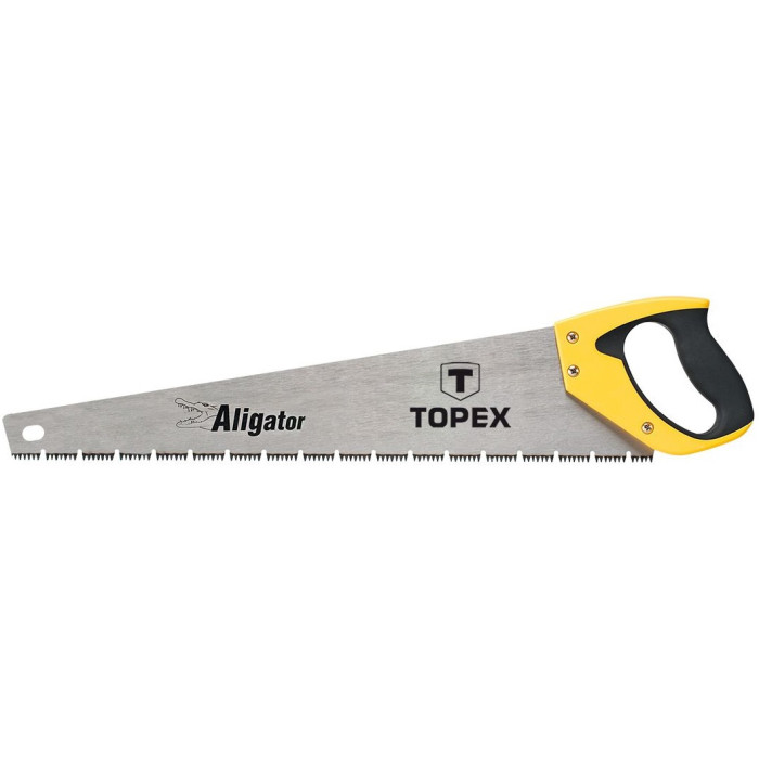 Пила алігаторна TOPEX (арт. 10A451) з довжиною полотна 500 мм. Тристороння заточка і загартування зубців значно знижує опір різанню і полегшує розпилювання деревини вздовж волокон. Ефективне зубцювання 7 зубців на дюйм спрощує роботу.