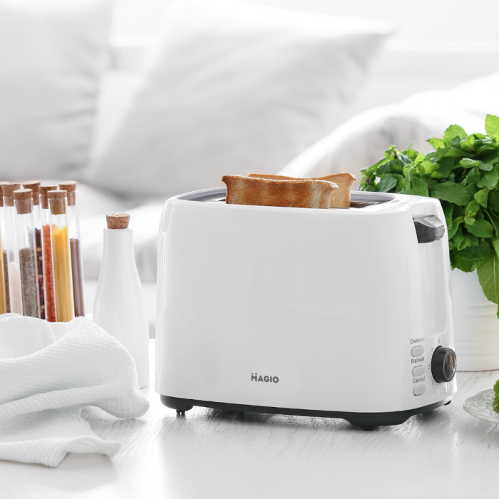 Тостер MG-278 максимально легко впишеться в інтер’єр кухні завдяки лаконічному білому кольору. Крім дизайнерського боку, він відмінно підрум’янить тости на сніданок, оскільки має потужність в 830 Вт.