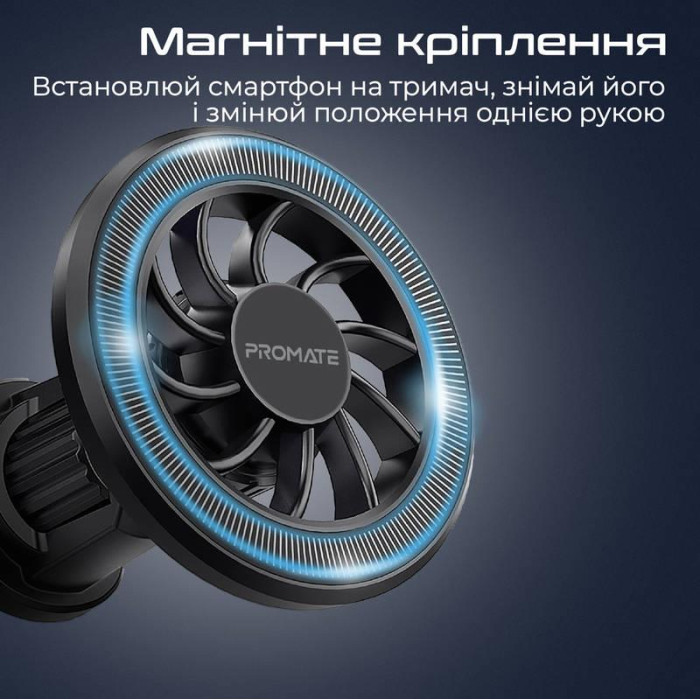 Promate Clipmount - автотримач із передовим дизайном у вигляді магнітного кільця. Надійна фіксація, універсальне кріплення та все це в компактному корпусі.