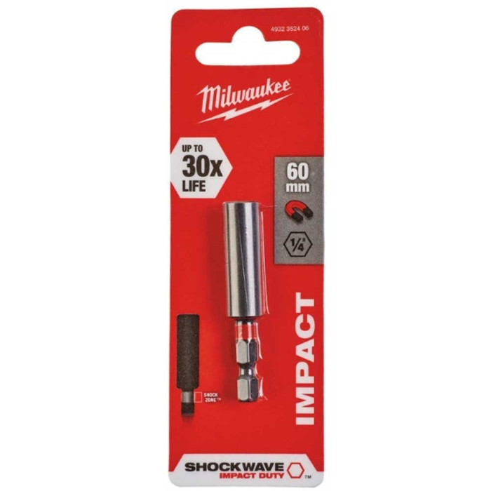 Бітоутримувачі SHOCKWAVE™ виготовляються на індивідуальне замовлення з спеціальної сталі, що містить формулу металу Milwaukee®. Це робить їх більш стійкими до ударів. Оптимізована зона SHOCK ZONE™ поглинає в 3 рази більше крутного моменту, що забезпечує більшу тривалість роботи інструменту. Подвійні внутрішні магніти забезпечують намагнічування застібок. Зручне автоматичне блокування дозволяє швидко змінювати біти однією рукою.