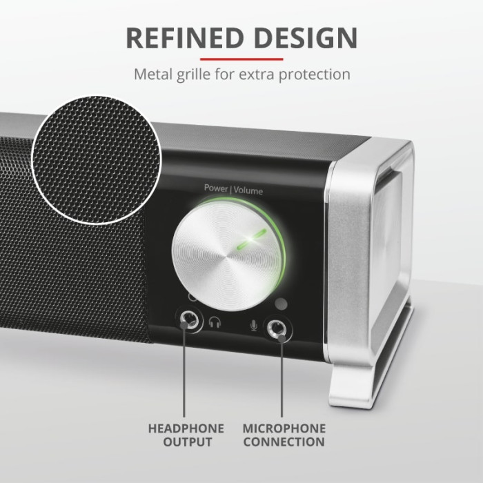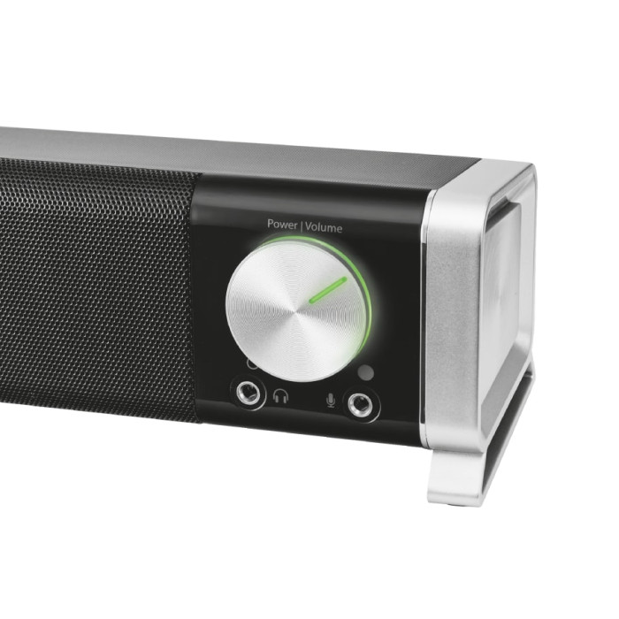 Компактний Asto Soundbar for PC & TV створений для легкого розміщення під будь-яким екраном ПК або в будь-який консолі вітальні. Звук доповнюється вишуканим горизонтальним дизайном. Для комфортного регулювання гучності оснащений ручкою , що підсвічується . Якщо для використання потрібні навушники або мікрофон - модель має зручні роз'єми на передній панелі для цих аксесуарів.