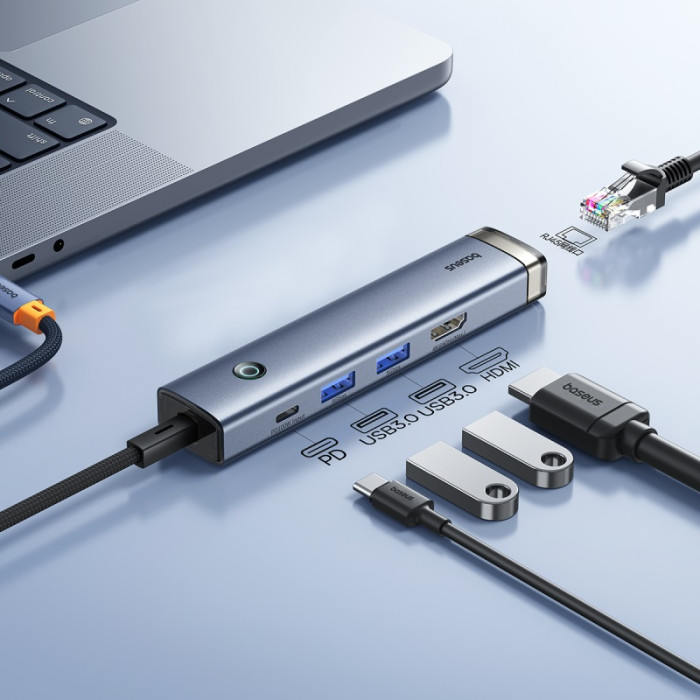 Baseus UltraJoy Series 5-Port HUB AIR — концентратор з двома портами USB-A, що працюють за стандартом USB 3.0, одним Type-C, що виконує функцію порту живлення 100 Вт і HDMI портом, який дозволяє насолоджуватися чудовою якістю зображення 4K та роз'ємом RJ-45 для підключення локальної мережі.Підключення не потребує встановлення драйверів. Просто підключіть роз'єм Type-C до відповідного гнізда на комп'ютері, і концентратор готовий до роботи. Про це сигналізує інтегрований світлодіодний індикатор.Інтерфейси розташовані на оптимальній відстані один від одного, що дозволяє використовувати всі роз'єми одночасно.КЛЮЧОВІ ПЕРЕВАГИ:− 2 порти USB 3.0 — передача даних зі швидкістю до 5 Гбіт/с (у 10 разів швидше, ніж USB 2.0).