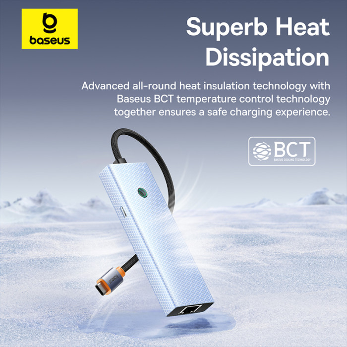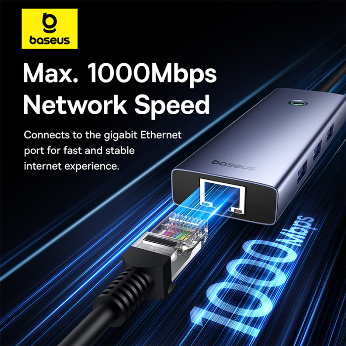 Baseus UltraJoy Series 5-Port HUB — концентратор з трьома портами USB-A, що працюють за стандартом USB 3.0, одним Type-C, що виконує функцію порту живлення 100 Вт та роз'ємом RJ-45 для підключення локальної мережі.Підключення не потребує встановлення драйверів. Просто підключіть роз'єм Type-C до відповідного гнізда на комп'ютері, і концентратор готовий до роботи. Про це сигналізує інтегрований світлодіодний індикатор.Інтерфейси розташовані на оптимальній відстані один від одного, що дозволяє використовувати всі роз'єми одночасно.КЛЮЧОВІ ПЕРЕВАГИ:− 3 порти USB 3.0 — передача даних зі швидкістю до 5 Гбіт/с (у 10 разів швидше, ніж USB 2.0).