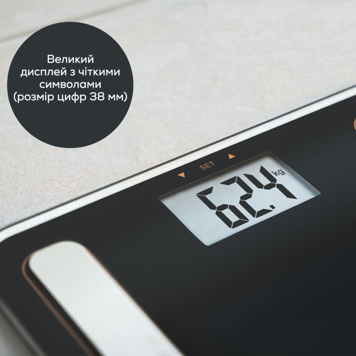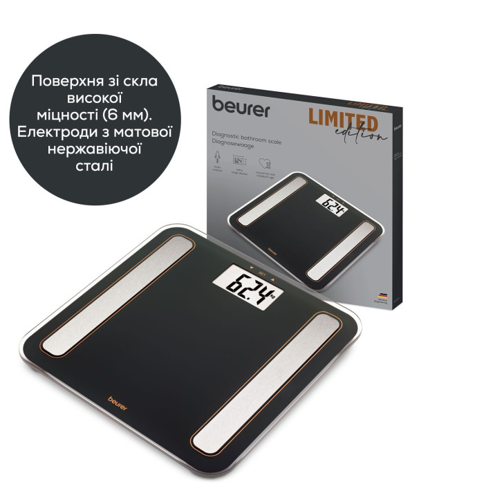 Ваги Beurer підлогові діагностичні, 180кг, підсвіч., дисплея, 1хCR2032, скло,чорний