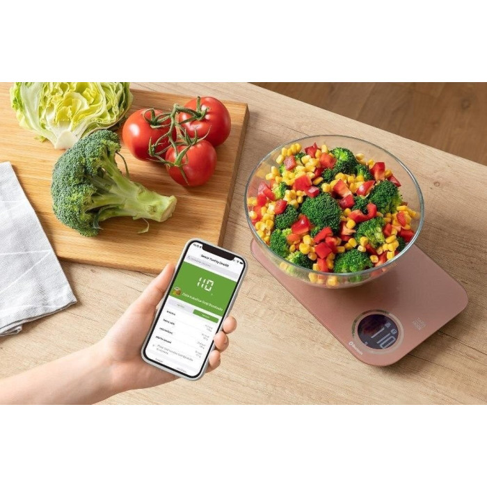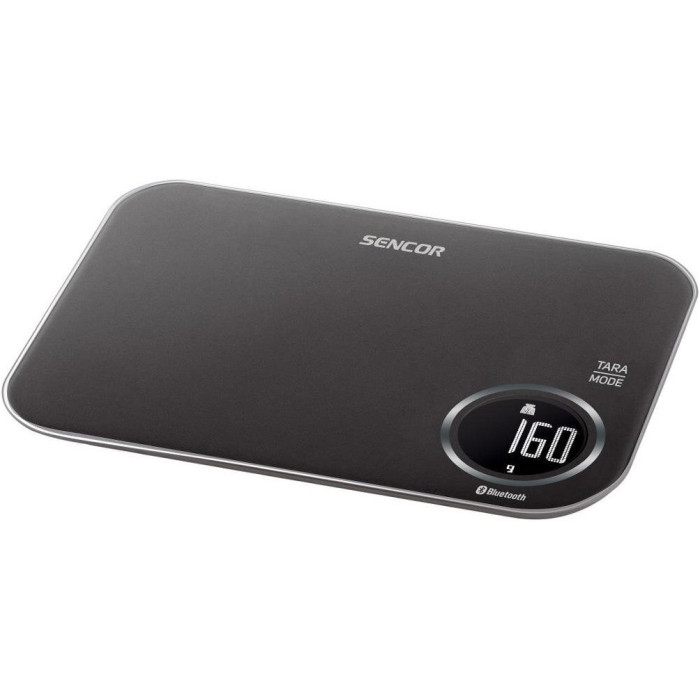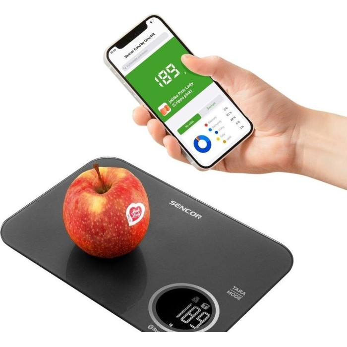 Ваги Sencor кухонні. Оригінальний додаток Sencor FOOD, створений у співпраці з авторами Dine4Fit з багатою базою даних продуктів харчування. Дає докладну інформацію про вживану їжу (вуглеводи, білки, жири, холестерин, клітковина…). РК-дисплей з білим підсвічуванням. 3 режими: режим зважування/режим вимірювання об'єму молока/режим вимірювання об'єму води.