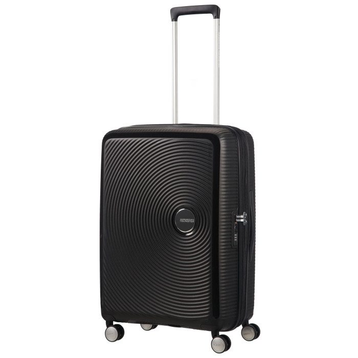 Валіза American Tourister Soundbox M — жорстка дорожня модель середнього розміру з корпусом із поліпропілену. Підходить для поїздок на кілька днів і авіаперельотів із багажним відділенням. Розширення на блискавці збільшує місткість із 71,5 до 81 л. Чотири подвійні колеса та телескопічна ручка спрощують транспортування. Вбудований TSA-замок підтримує контроль без пошкодження корпусу.