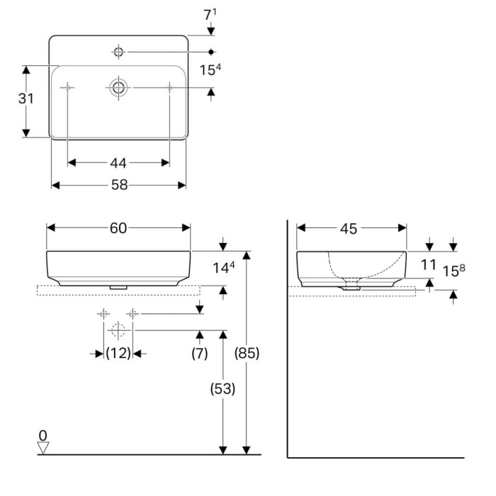 Умивальник вбудований на стільницю GEBERIT VARIFORM , прямокутний, 60*45см, з поличкою для отвору під змішувач, з переливом (500.780.01.2)