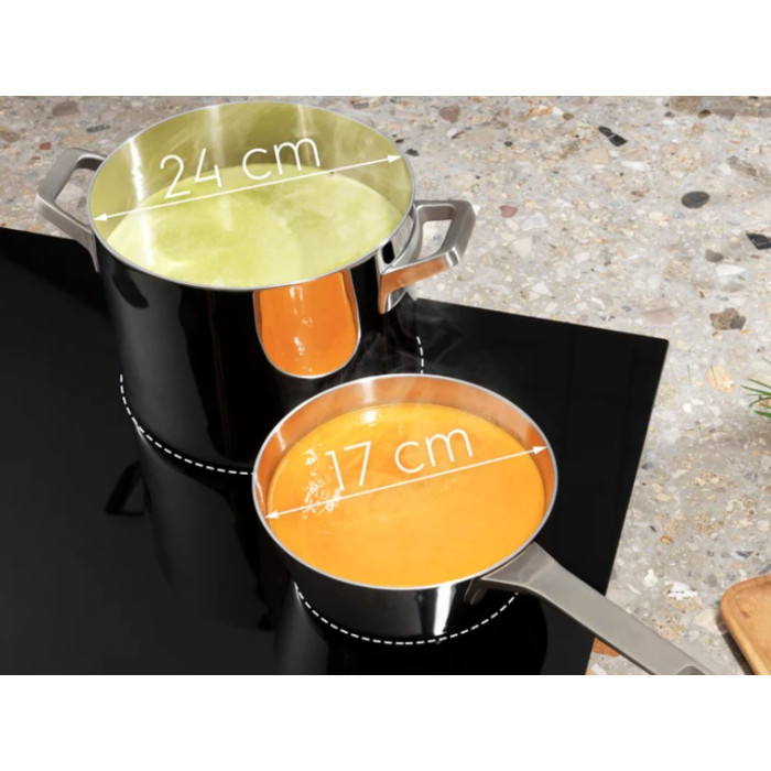 Ідукційна варильна поверхня серії 600 з функцією Bridge дає змогу об’єднати дві окремі зони готування в одну велику. Завдяки автоматичному узгодженню температури й часу вона ідеально підходить для готування на гриль-планчі чи у місткому горщику. За допомогою функції DoubleBridge можна об'єднати дві зони готування на двох різних ділянках варильної поверхні. Об'єднані зони матимуть ідеально відрегульовані налаштування температури та часу. Інтерфейс із 5 регуляторами індивідуальних зон дає змогу налаштовувати таймер, рівень потужності (до 9 рівнів) й інші параметри окремо для кожної з 5 зон. Насолоджуйтеся гнучкістю і свободою під час готування.