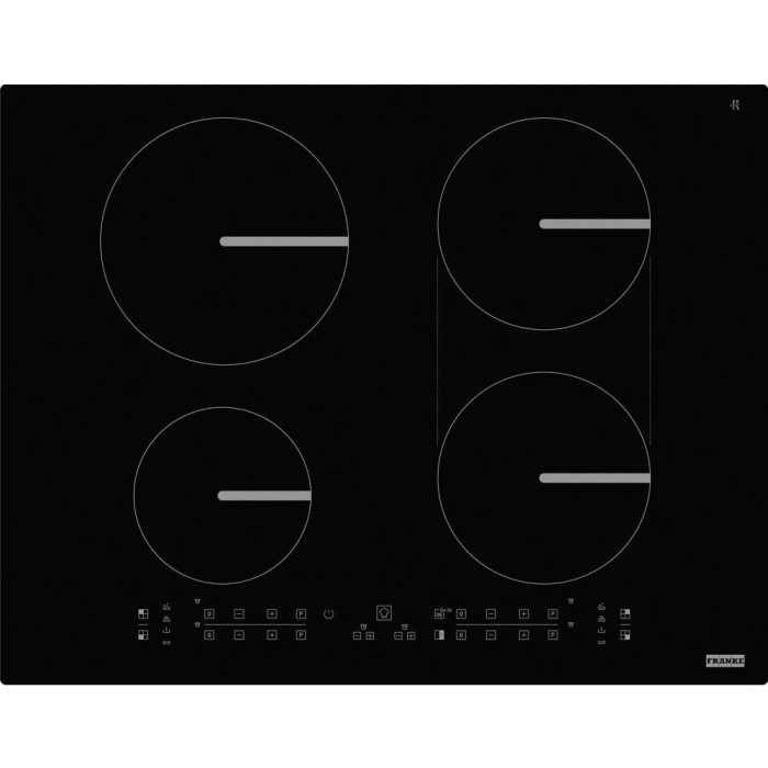 Franke FSM 654 I B BK — індукційна варильна поверхня шириною 60 см з 4 зонами нагріву, сенсорним слайдер-керуванням та функцією Bridge для об’єднання зон. Підтримує 9 рівнів потужності + бустер на кожній зоні (макс. 3000 Вт), обмеження загальної потужності (2,5–7,2 кВт), функції підтримання тепла, тушкування, плавлення, кипіння. Внутрішнє скло чорне, без рамки, номінальна потужність 7,2 кВт. Є блокування панелі управління та таймер. Підходить для вбудовування в стільницю стандартним або врівень монтажем.