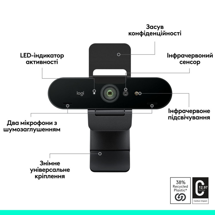 Програма Logi Options+ спрощує керування персональним пристроєм завдяки збільшенню/зменшенню масштабу, попередньому налаштуванню кольорів, регулюванню кольору, ручному фокусуванню та простому оновленню програмного забезпечення.