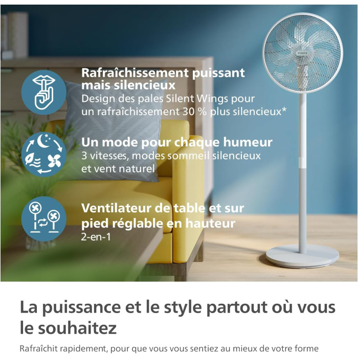 Philips CX2550/00 — це підлоговий вентилятор з інтелігентними функціями, який забезпечує потужне охолодження та максимальний комфорт. Завдяки технології SilentWings рівень шуму знижено до всього 19 дБ, що дозволяє насолоджуватись тишею навіть при роботі пристрою. Діаметр лопатей 40 см у поєднанні з потужністю 48 Вт забезпечують ефективну циркуляцію повітря. Функція автоматичного повороту на 180° дозволяє рівномірно розподіляти прохолоду по всій кімнаті. Наявність таймера (1, 2, 4, 8, 12 годин), трьох швидкостей та режимів «Природний бриз» і «Нічний режим» робить його надзвичайно зручним у використанні. Білий мінімалістичний дизайн пасуватиме до будь-якого інтер'єру.