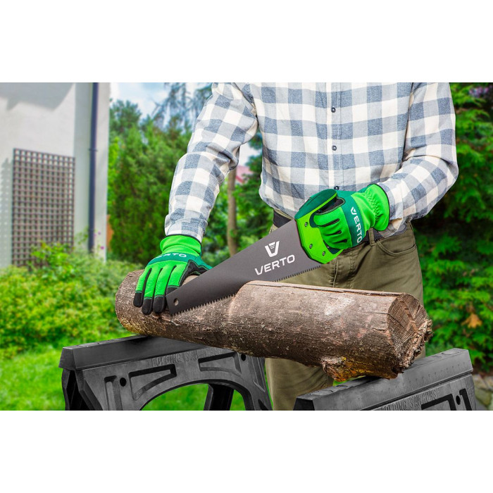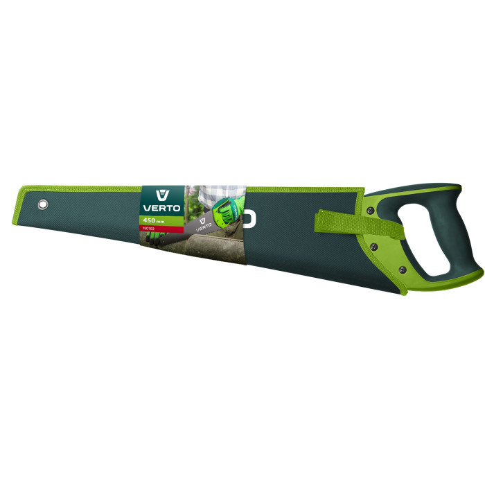 Ножівка VERTO (арт. 15G102) довжиною 450 мм. Тристороннє гостріння та гартування зубців значно знижує супротив під час різання, натомість тефлонове покриття спрощує розпилювання дерева вздовж волокон.
