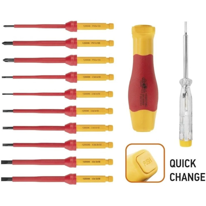 Набір змінних викруткових наконечників NEO, що складається з 12 предметів, сертифікованих для роботи під напругою до 1000 В. Матеріал - легована сталь S2, завдяки якій твердість наконечників становить 60 HRC, що значно підвищує їх міцність і якість роботи. У наборі є багатий пакет наконечників стандартного та спеціалізованих типів довжиною 100 мм.