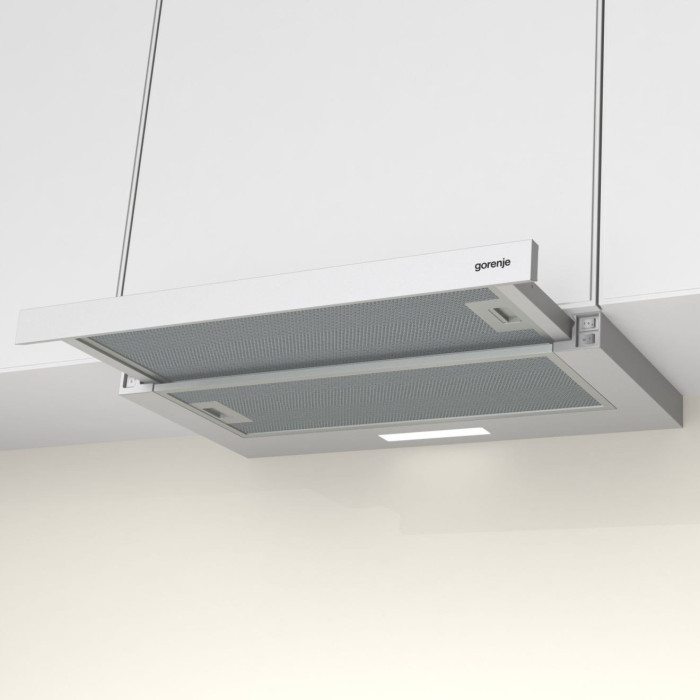 Витяжка Gorenje TH60E3W чудово доповнить будь-який інтер'єр. Модель може працювати як у режимі відведення, так і в рециркуляції.
