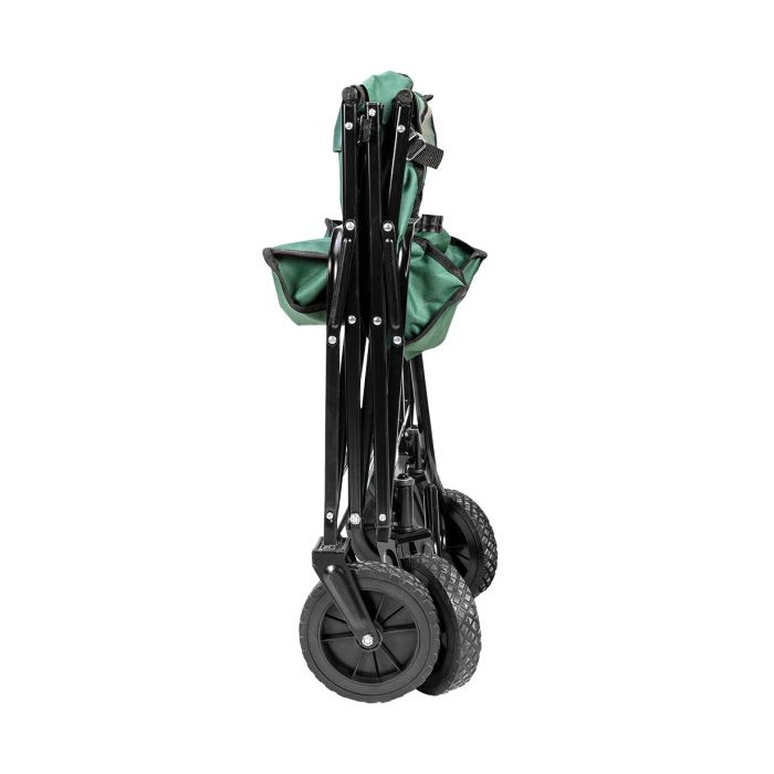 Складний садовий візок Neo Tools 84-405 із сталевою рамою та нейлоновим полотном 600D розрахований на перевезення інструментів, ґрунту, врожаю та господарських вантажів до 80 кг. Розміри 90×50×113 см і завглибшки 30 см дають достатній об'єм для великих завантажень, а колеса 8" забезпечують стійкий рух по нерівному ґрунту. Два бічні кармани зручні для дрібного садового приладдя. Складна конструкція мінімізує місце під час зберігання в сараї чи гаражі.