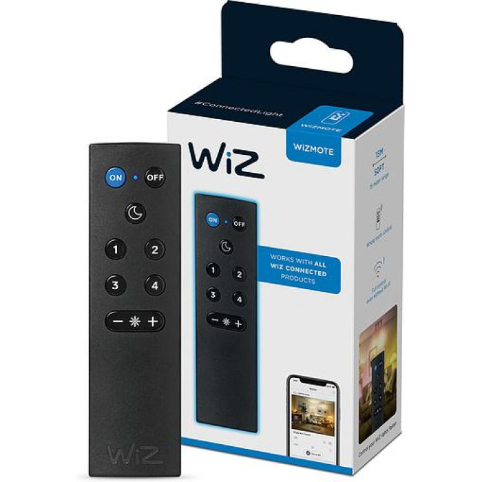 WiZmote дозволяє швидко та легко керувати світловими приладами WiZ. Налаштуйте світло на увімкнення/вимкнення, налаштуйте яскравість, перейдіть на нічник і виберіть один із 4 улюблених режимів освітлення одним натисканням кнопки. Працює з усіма продуктами WiZ Connected та керує всім освітленням у кімнаті. Широкий діапазон керування до 15 метрів і працює навіть за відключеного Wi-Fi.